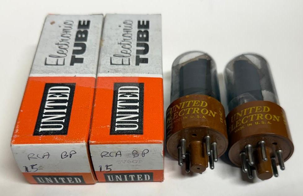 NOS, labeled and boxed as United Electron. Best deal on RCA 6V6GT blackplates since they're rebranded. Only one pair in stock!